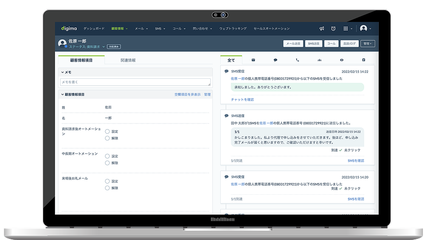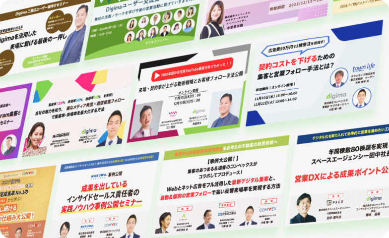 はい。Digimaは現場での運用を前提に設計されており、営業担当が日々の業務の中で無理なく使える“シンプルな運用性”が特長です。専任の担当者がいなくても、反響対応・追客・来場フォローまでを仕組み化することが可能です。