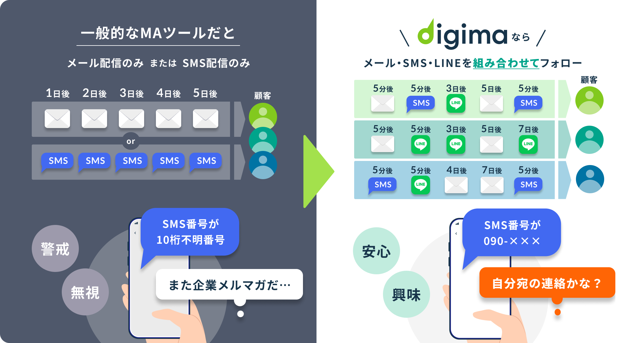 メール/SMS/LINE/電話など、複数チャネルを顧客ごとに最適化して自動配信。